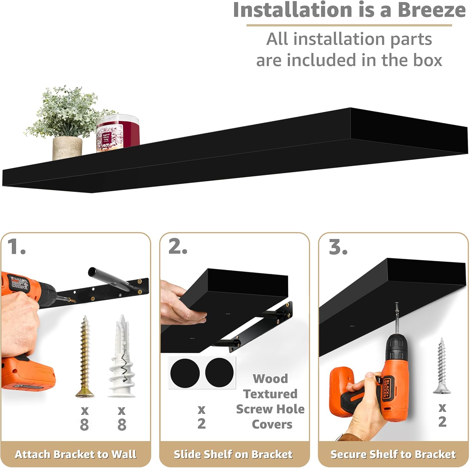 - Easy to Install: Minor assembly required, detailed instructions included. Hanging shelves are made of beautiful, engineered faux wood (not solid wood) with a smooth matte finish. Enhanced steel brackets attach firmly to the wall. Sturdy enough to hold up to 22 lbs. Mounting hardware INCLUDED. Color of bathroom shelf may be slightly different from the product photos due to lighting and screen settings