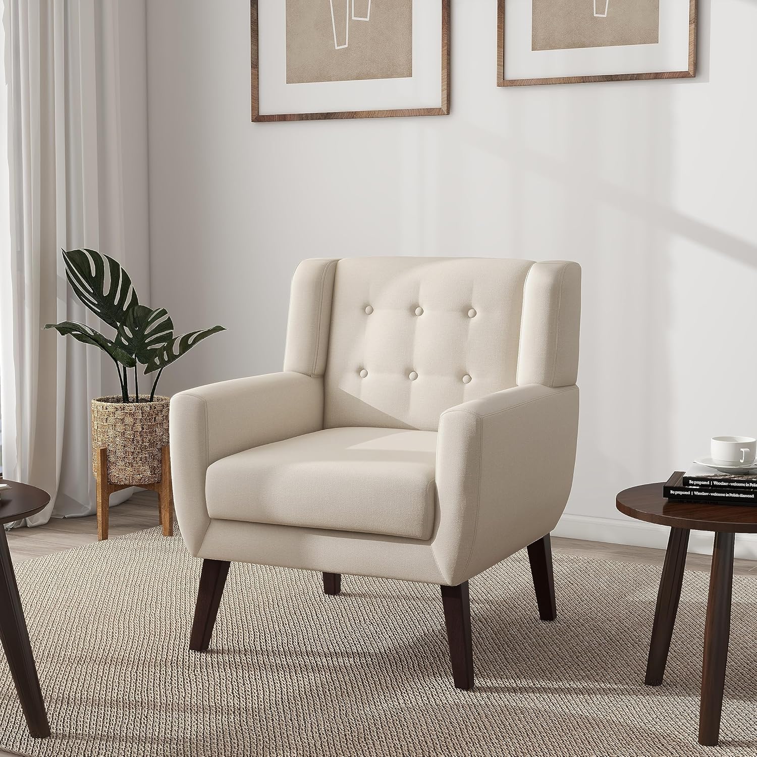 - Comfortable Accent Chair - The Angle of the back, the position of the arms, and the width are ergonomic. The wide backrest and seat, made of highly elastic sponges and springs, provide you with maximum comfort. The fabric finish and solid wood legs are paired together for a simple and fresh look.