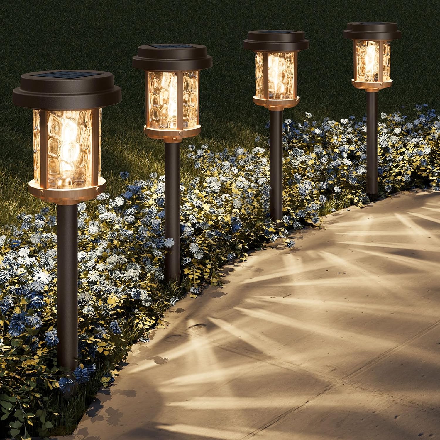 - Premium Durable Construction: Solar lights outdoor with upgraded materials ensure longevity: Rust-proof powder coating metal lid, stainless steel pole, and impact-resistant ABS spikes penetrate hard soil. Artistic corrugated glass makes these sidewalk lights solar powered both functional and decorative.