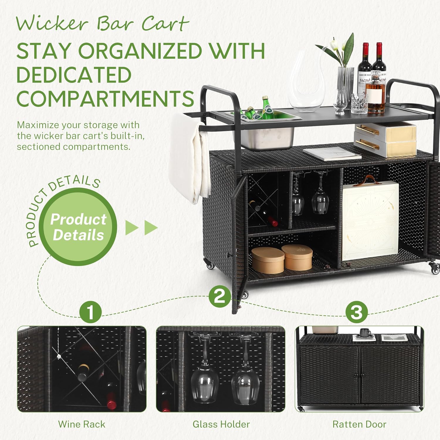 - ORGANIZED STORAGE: Stay organized with the wicker bar cart's dedicated compartments. The cart includes a wine rack and a glass holder, making it easy to store and access your bottles and drinkware. The smart design allows for quick setup and easy access