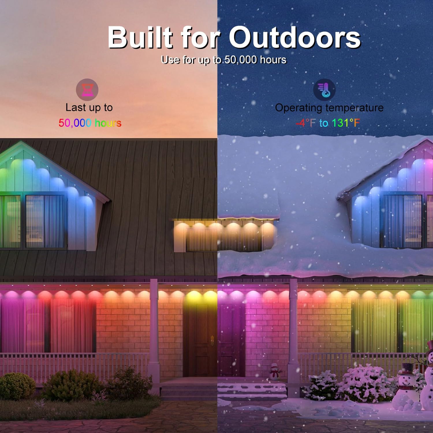- RGB+IC Lighting: You can choose your favorite mode from a wide range of scene modes to light up Christmas with the permanent outdoor lights. This Christmas light can also be DIY set for lighting effects, suitable for various outdoor occasions.