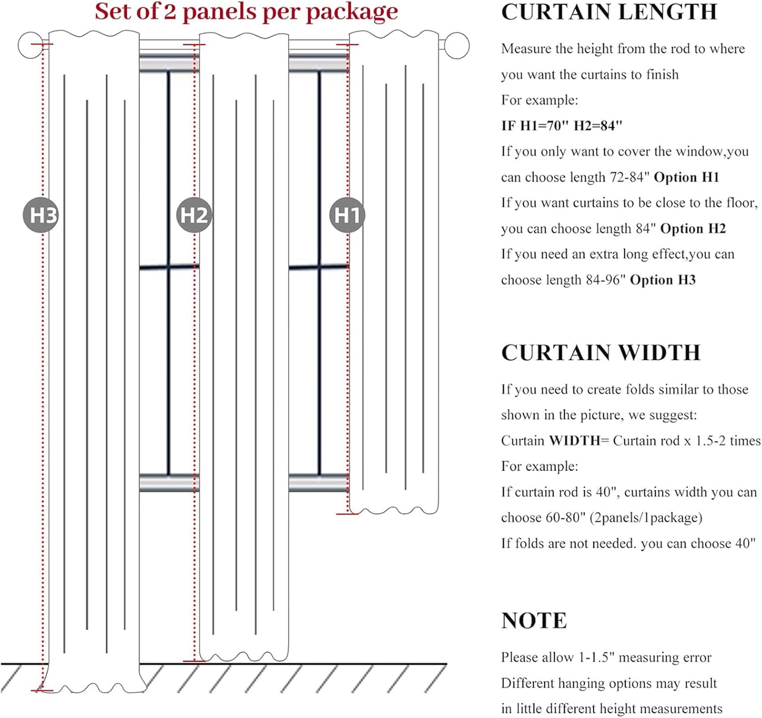 - Ready Made:Set of 2 pinch pleated curtain panels per package with 16 metal rings and 16 adjustable plastic hooks(The adjustable hook can raise and lower the height of the curtain by 1 inch),Each panel measures 40"W x 100"L,pair measures 80"W x 100"L