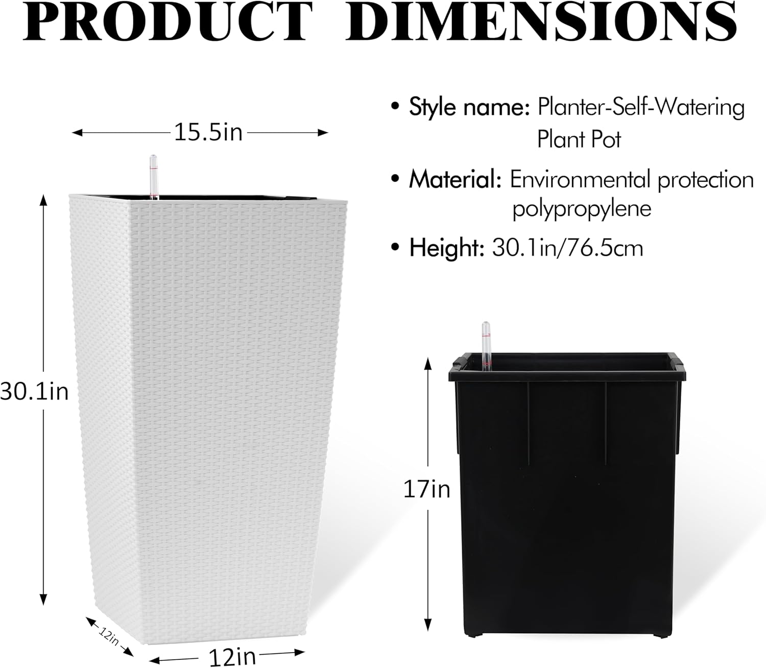 30in Tall Large Plant Pots Planter-Self-Watering Indoor/Outdoor Planting with Drain Holes, Water Level Monitor, Inner Bucket for Front Porch Patio, White Large