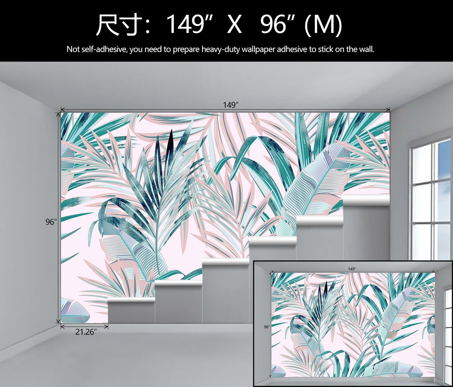 - Mural Size: The total size of this mural wallpaper is 149" x 96" / 378CM x 244CM (W x H), cut into 7 pieces, each measuring 21.26" x 96", for easy installation.