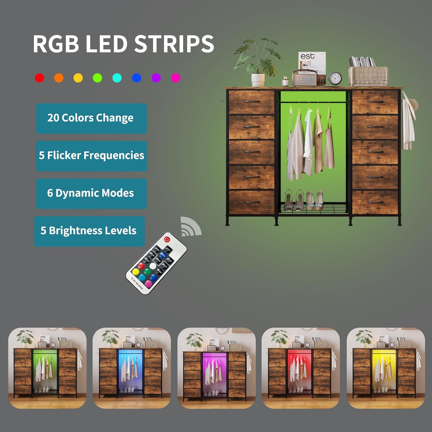 - [ Built-in LED Strips ] The dresser with the RGB LED Strips, which have 20 colors for change, 6 dynamic modes, 5 flicker frequencies, 5 brightness levels, create a cozy ambiance with the LED lights that illuminate the dresser, adding a touch of sophistication to your space