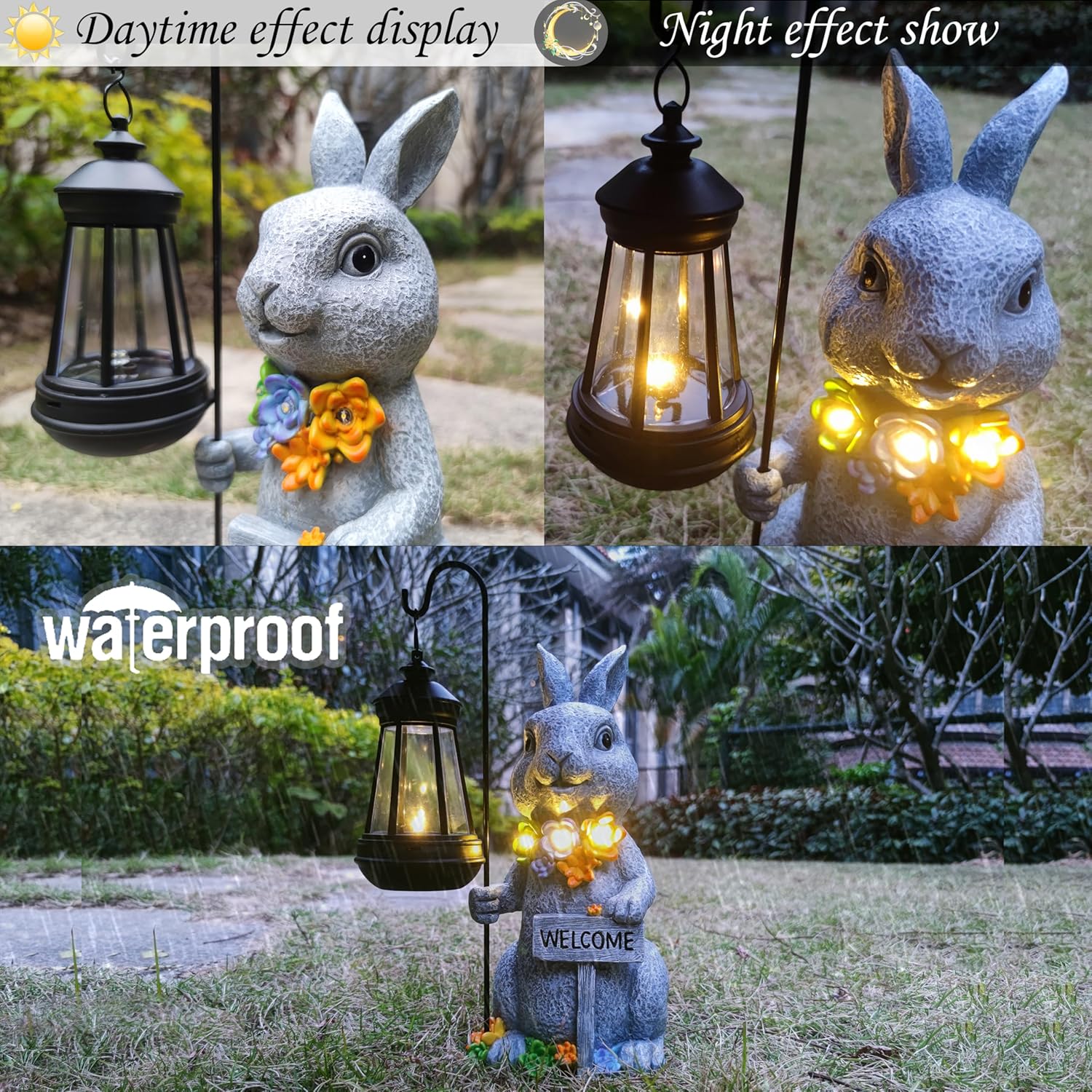 Solar Rabbit Garden Statues Outdoor Décor with Lantern- Rabbit Figurines Solar LED Light Lawn Ornaments - Yard Decorations for Patio, Balcony, Backyard -Unique House Warming Gifts for Mom