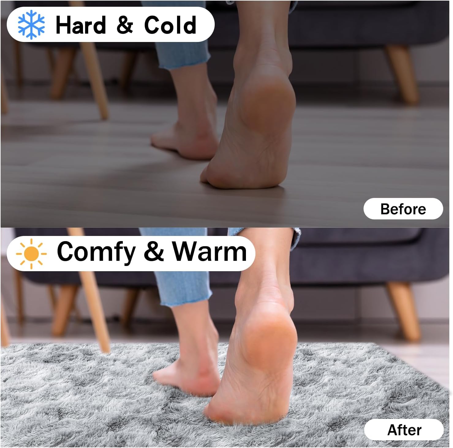- Rezutan Area Rugs-Soft Fluffy Rug: The Rezutan shag area rug is crafted from durable microfiber, ensuring a plush and incredibly comfortable experience. Its 1.7-inch high pile surface is dense and velvety to the touch, while the 0.3-inch memory foam provides superior cushioning, isolating you from the cold ground and offering soundproofing benefits. Because of the plush fur on the Soft Fluffy rug, you’ll feel like walking on the clouds when walking barefoot on the large bedroom rugs.