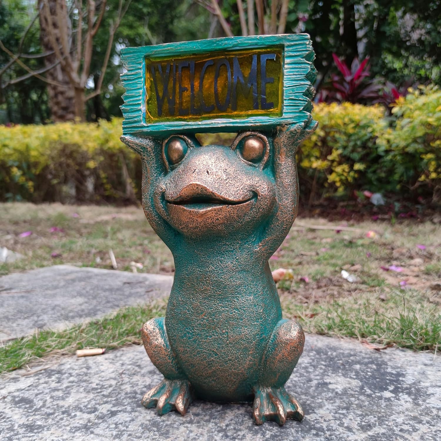 - 【Product Design】Our product is a solar-powered frog statue holding a welcome sign,This outdoor solar Statue can enhance the creative charm of your outdoor spaces such as gardens, porches and courtyards. It is an excellent choice for adding a touch of fun to any environment, especially for Mother's Day, Christmas, Thanksgiving and other festivals,The size of the statue is 6.1X4.9X11.5 inches,This statue is made of durable polyresin and has rechargeable batteries included.