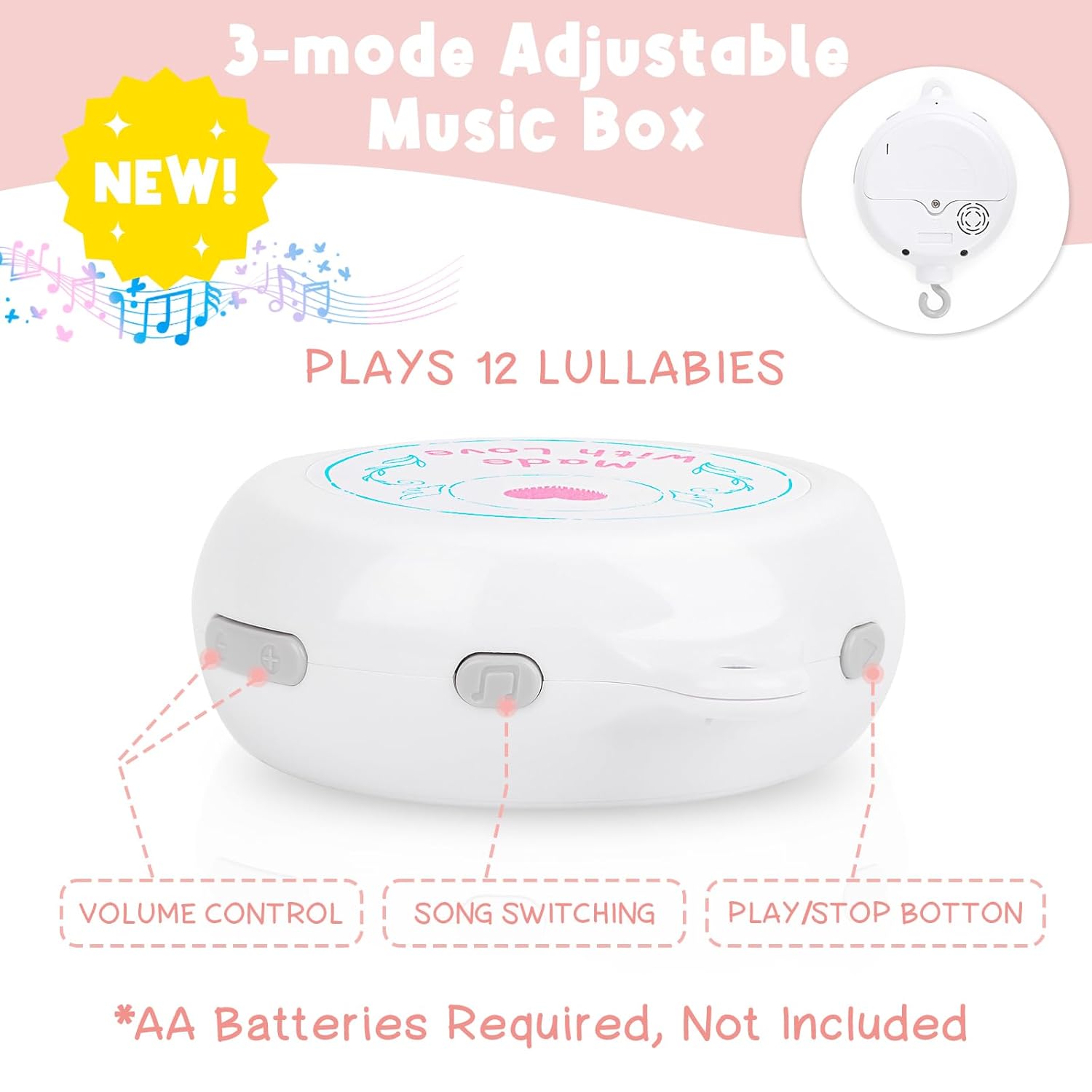 - 12 Soothing Lullabies: The upgraded 3-mode music box lets you choose rotation, music, or both. Soft melodies and gentle spinning create a calming bedtime routine for baby and parents alike