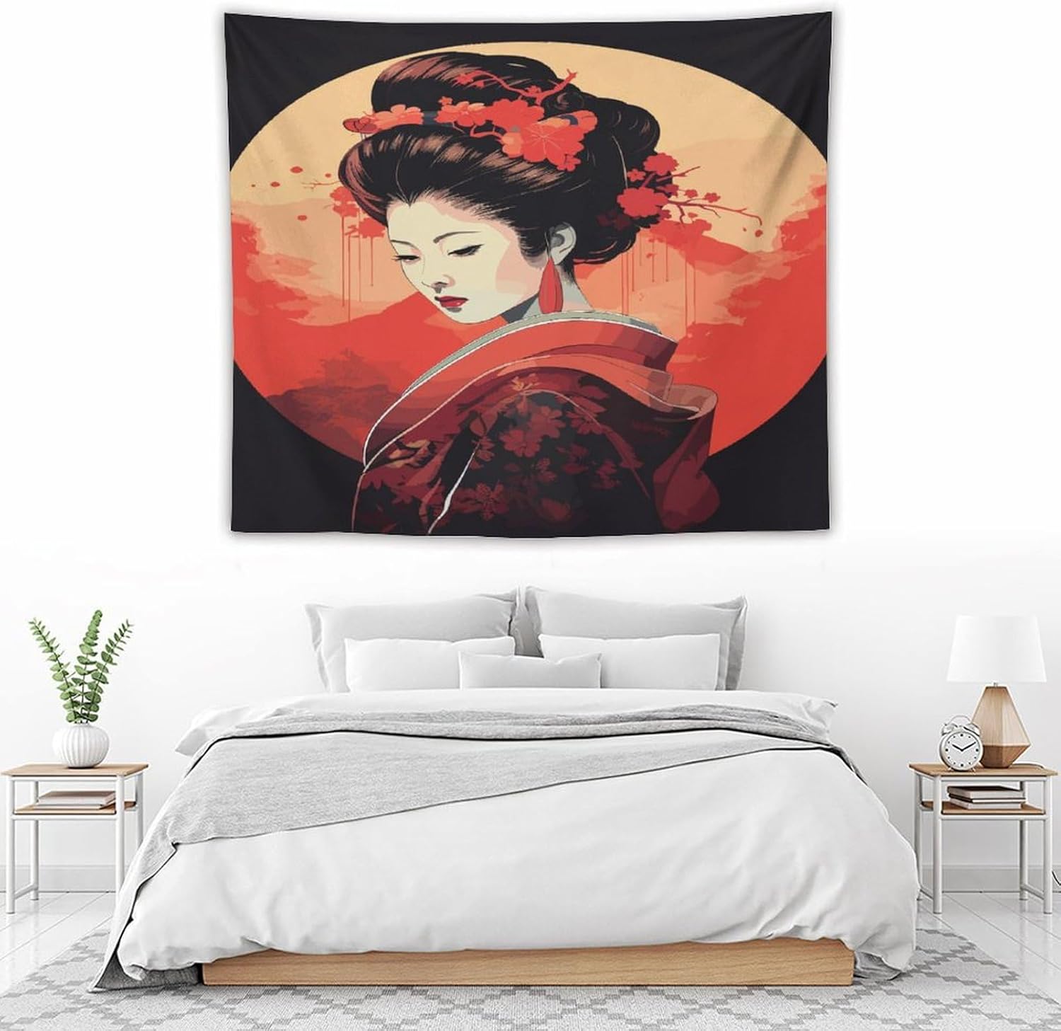 Japanese Woman Geisha Tapestry Asian Cherry Blossom Red Sun Traditional Kimono Folk Tapestries Home Decor for Living Room Bedroom Apartment Farmhouse Dorm 60"x50"