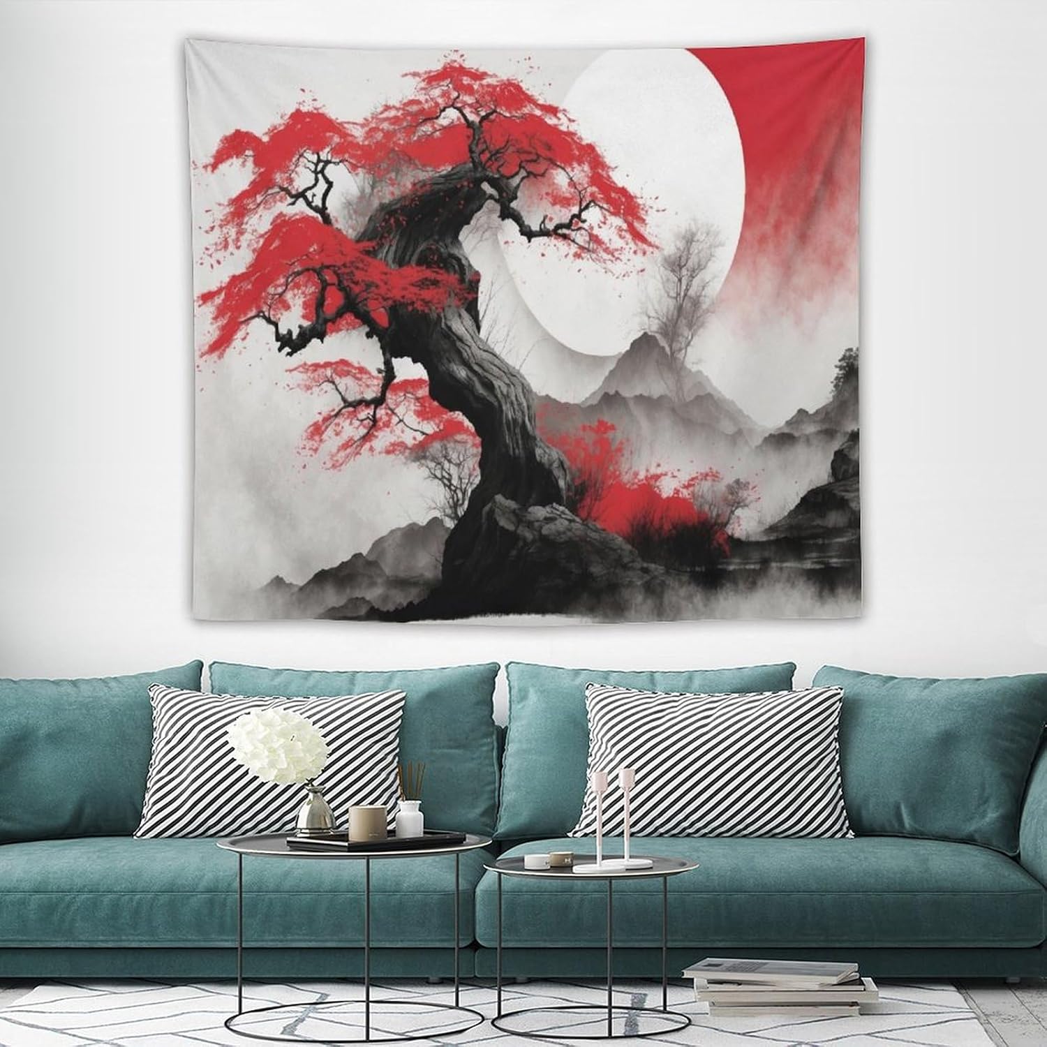 Cherry Blossoms Tapestry,Japanese Red Landscape Asian Watercolor Abstract Art Tapestry,Japanese Wall Tapestry, Nature Landscape Tapestries for Bedroom Living Room Decor 60"x50"
