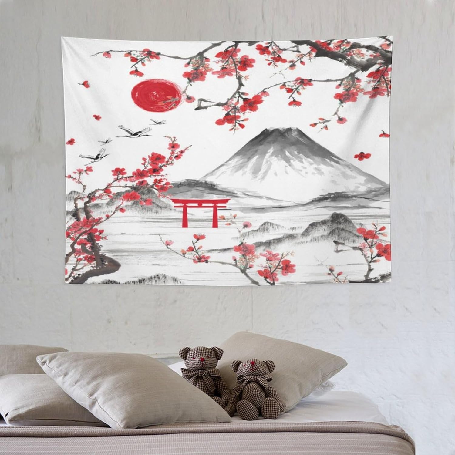 Red Cherry Blossoms Tapestry, Japanese Fuji Mountain Tapestry, Asian Japanese Wall Tapestry, Nature Landscape Tapestries for Bedroom Living Room Decor 40"x30"