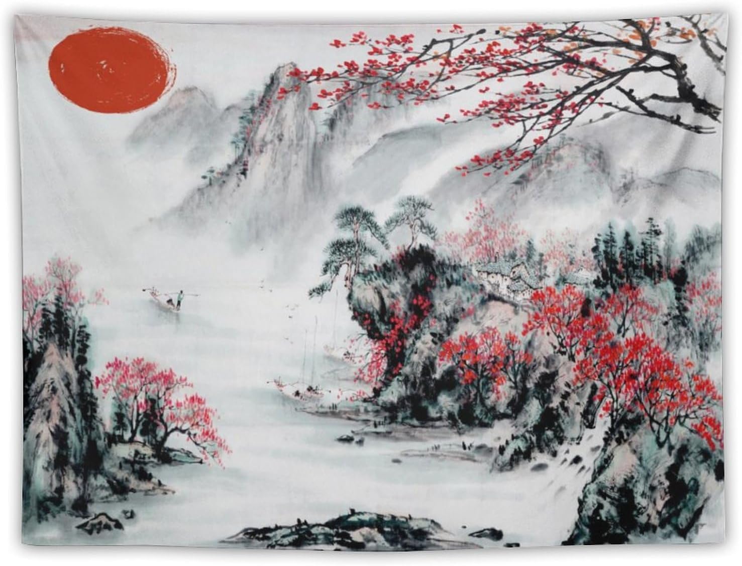 Cherry Blossoms Tapestry,Japanese Red Landscape Asian Watercolor Abstract Art Tapestry, Asian Japanese Wall Tapestry, Nature Landscape Tapestries for Bedroom Living Room Decor 90"x60"