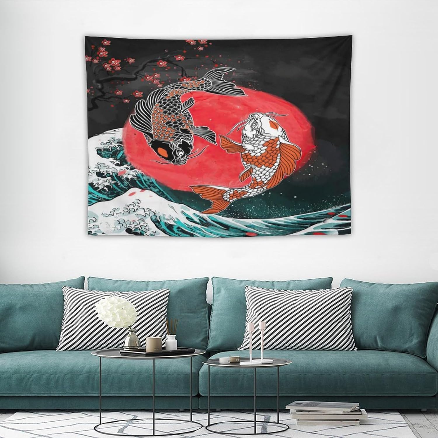 Houselerax Koi Fish Tapestries,Japanese Style Yin Yang Big Wave Cherry Blossoms Tapestry Wall Hanging for Bedroom Living Room Office Decor 40"x30"