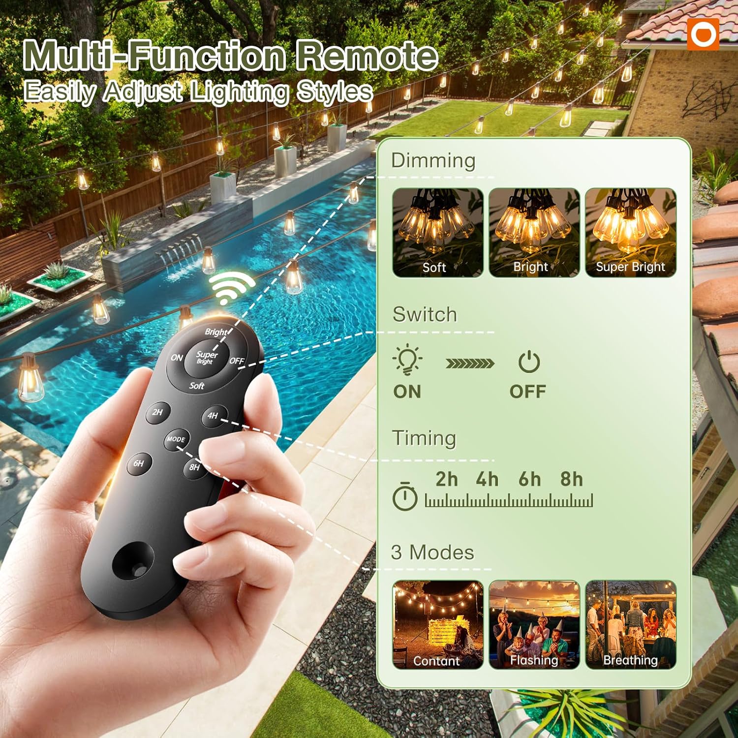 - UPGRADED! Remote Control: Our advanced remote control marries ease with innovation for next-gen solar string lights: 3 Brightness Mode: Soft/Bright/Super Bright, 3 Light Mode: Breathing/Flashing/Constant, 4 Timing Control: 2/4/6/8 Hrs. One remote, endless charm—no extra timers and dimmer required