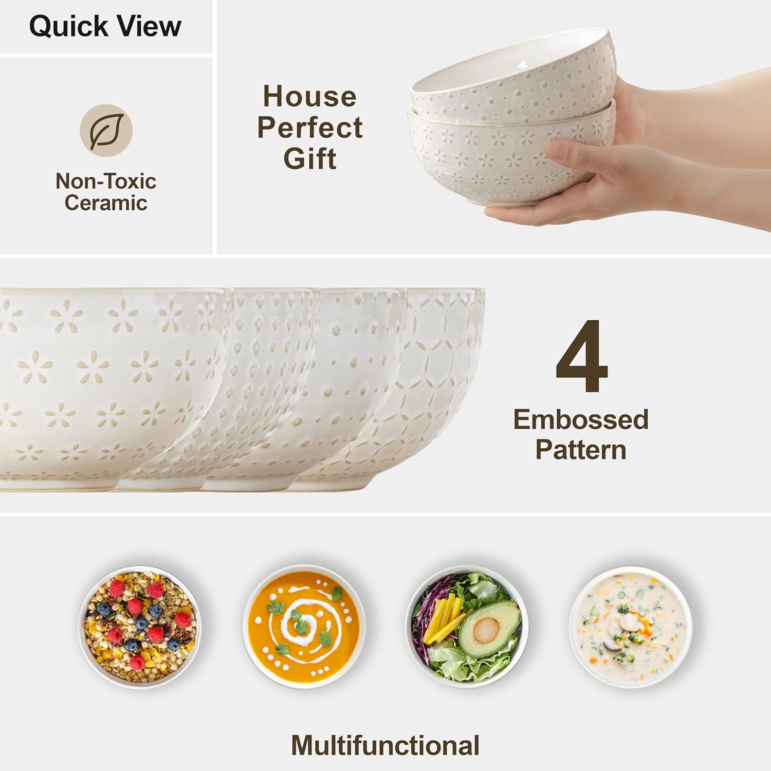 - 【Versatile Bowls Set of 4】Embossed soup bowls measure 6.3 inches in diameter and hold up to 30 oz. These bowls set for kitchen are great for serving soup, cereal, salad, pasta, desserts, snacks, breakfast oats, ice cream or broth