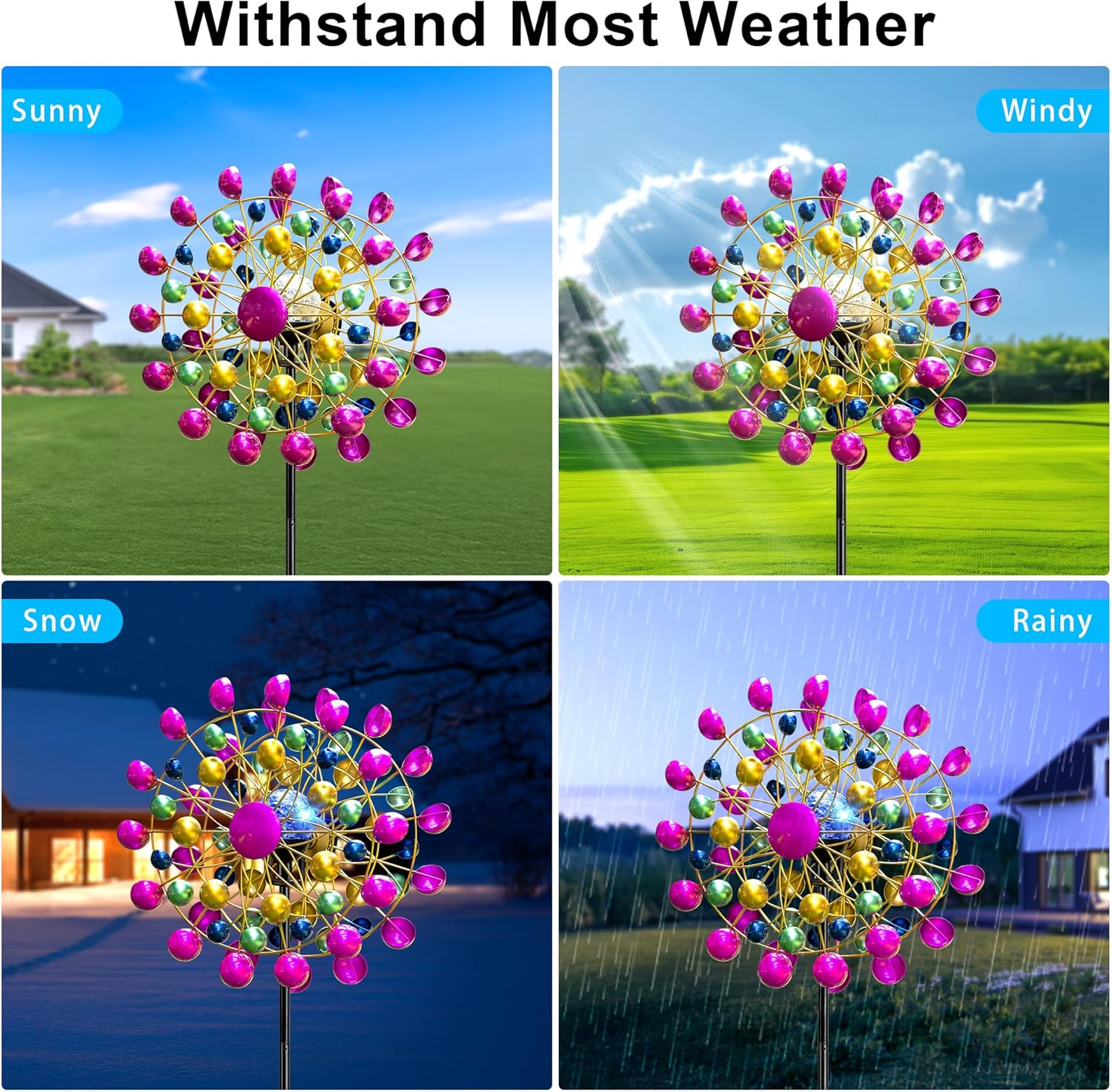 - Eye-Catching Ferris Wheel Design: This solar-powered windmill light features a unique ferris-wheel-shaped frame with colorful, iridescent blades that glisten in the sunlight. The vibrant, multicolored globe beads add a touch of whimsy and charm, creating a magical and captivating focal point in any outdoor space.