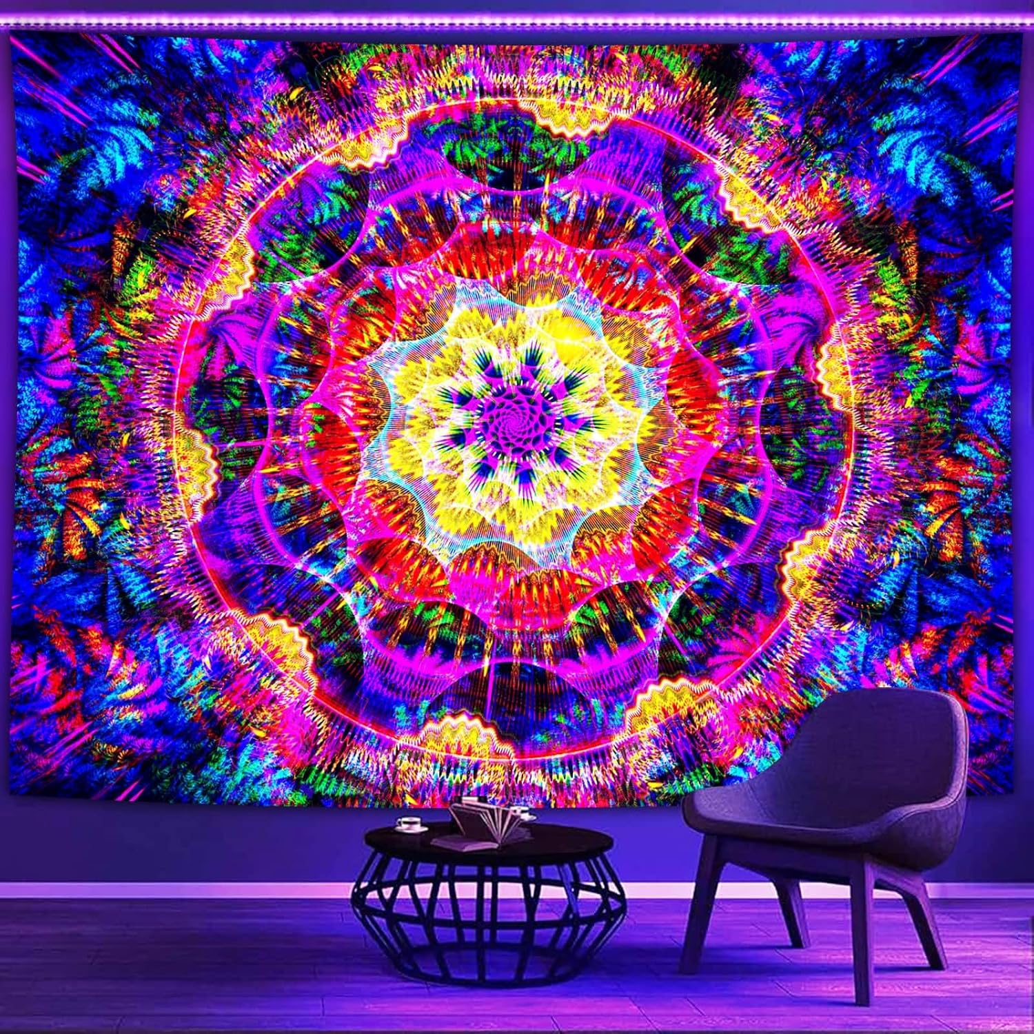 PSYHILAR Blacklight Mandala Tapestry for Bedroom, Psychedelic Black Light Posters for Adults and Teens, Colorful UV Reactive Aesthetic Bohemian Art Wall Hanging Decor (60 x 50 Inches)