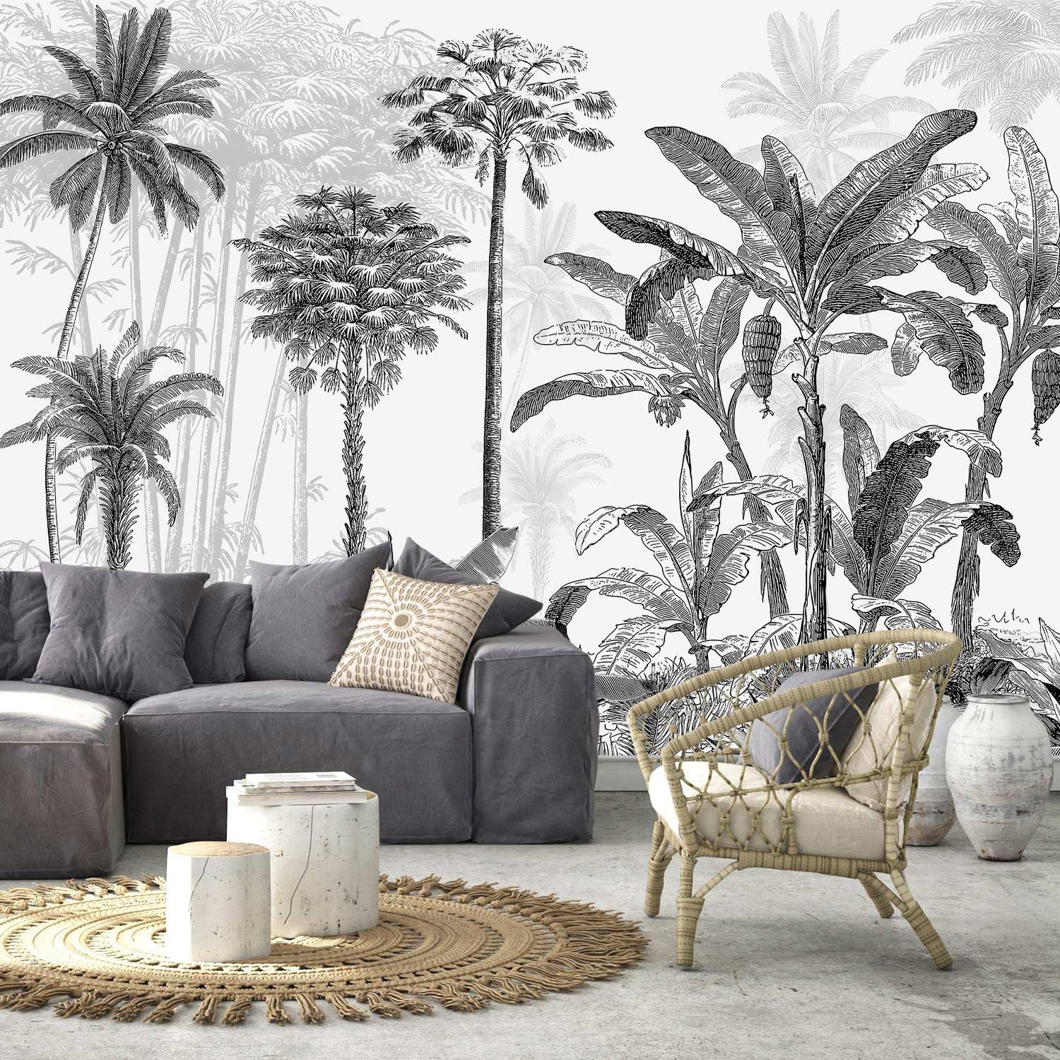 AFZEVEB-Black and White Jungle Wallpaper Hand-Painted Tree Wall murals for Bedroom 114"x74" (Not Peel and Stick)