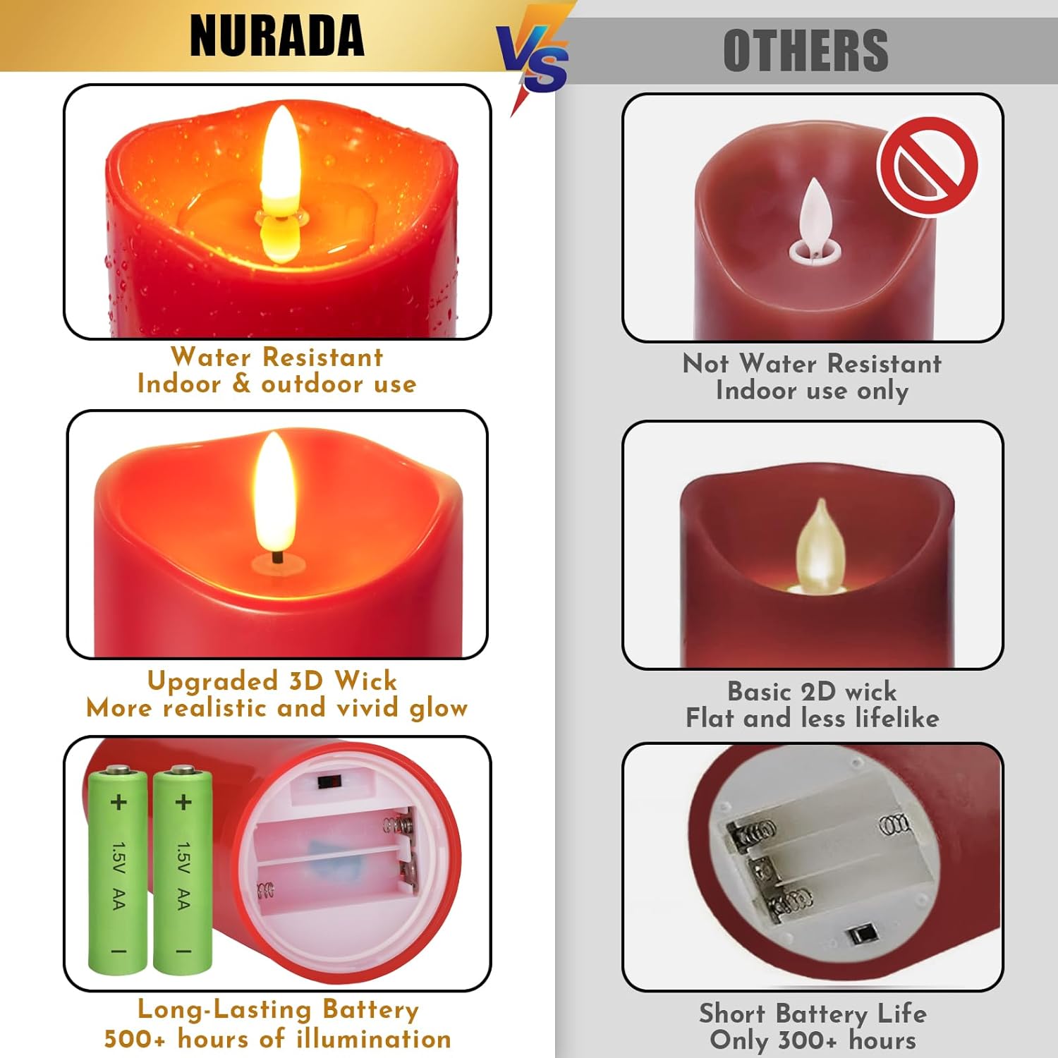 NURADA Outdoor Flameless Candles with Remote Timer - Waterproof Realistic Flickering LED Pillar Electric Battery Operated Fake Candle for Home Wedding Christmas Decor - 3 Pack Red(D3”H4”6”8”)