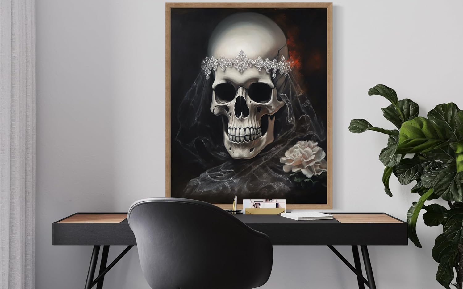 Skull Bride Poster Art Print, Halloween Scary Vintage Wall Art Academia Spooky Painting Decoration for Horror Prints, Gothic Posters Bedroom Decor 89 (Skull Bride, 11 x 14 inches, Wood Frame)