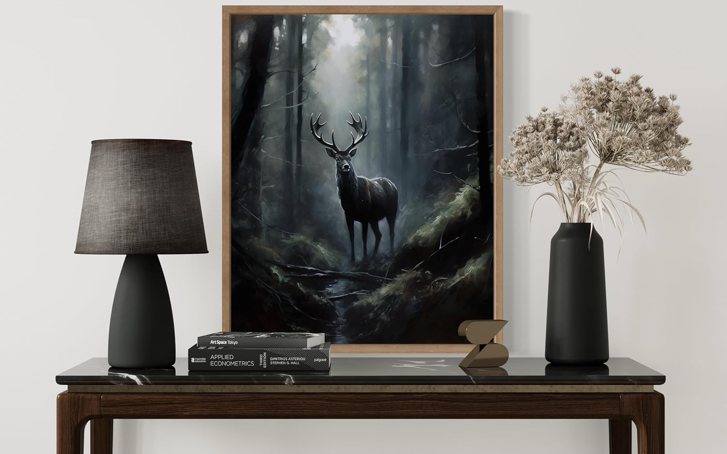 Deer in Forest Poster Art Print, Halloween Scary Vintage Wall Art Academia Spooky Painting Decoration for Horror Prints, Gothic Posters Bedroom Decor 89 (Deer in Forest, 11 x 14 inches, Wood Frame)