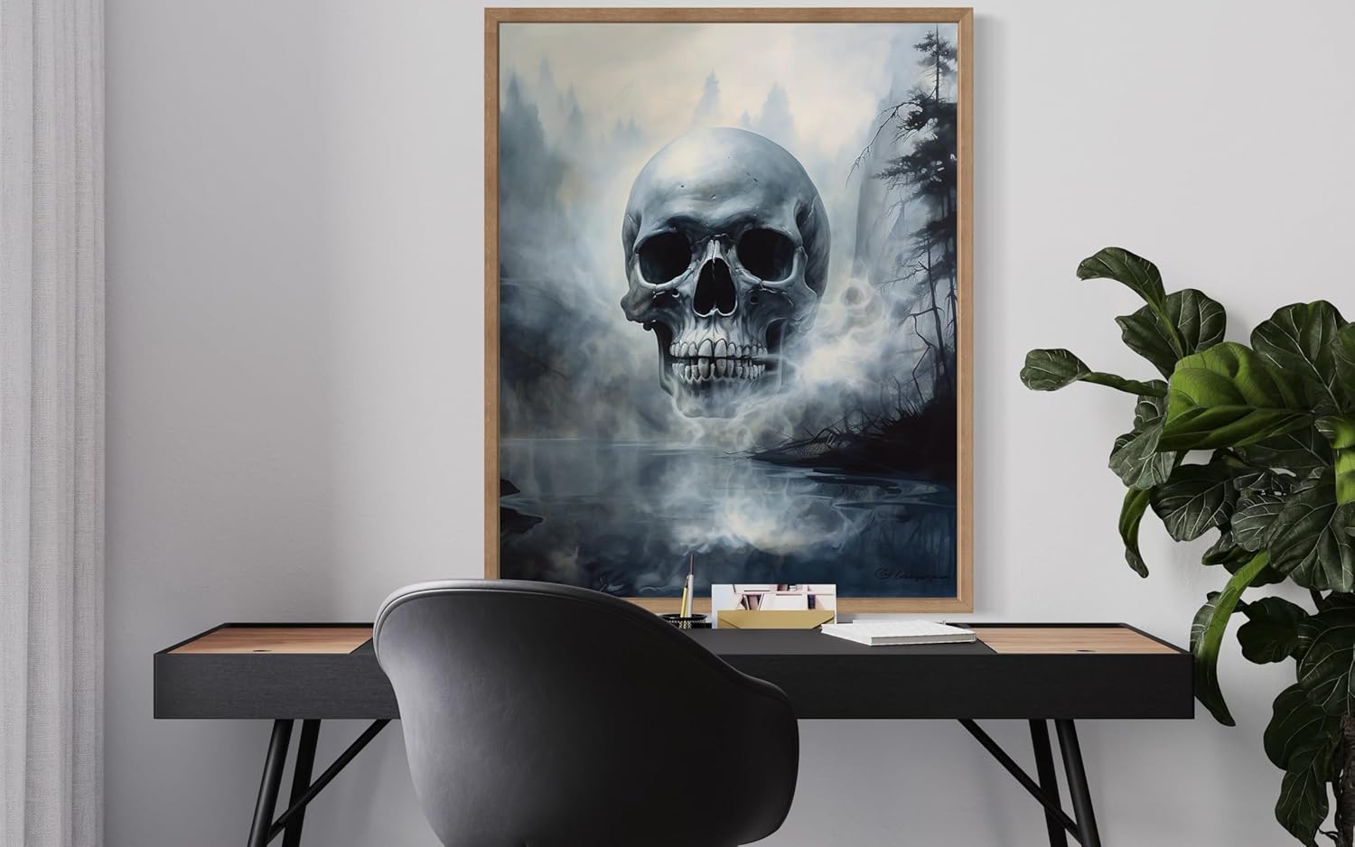 Foggy Skull Poster Art Print, Halloween Scary Vintage Wall Art Academia Spooky Painting Decoration for Horror Prints, Gothic Posters Bedroom Decor 89 (Foggy Skull, 11 x 14 inches, Wood Frame)