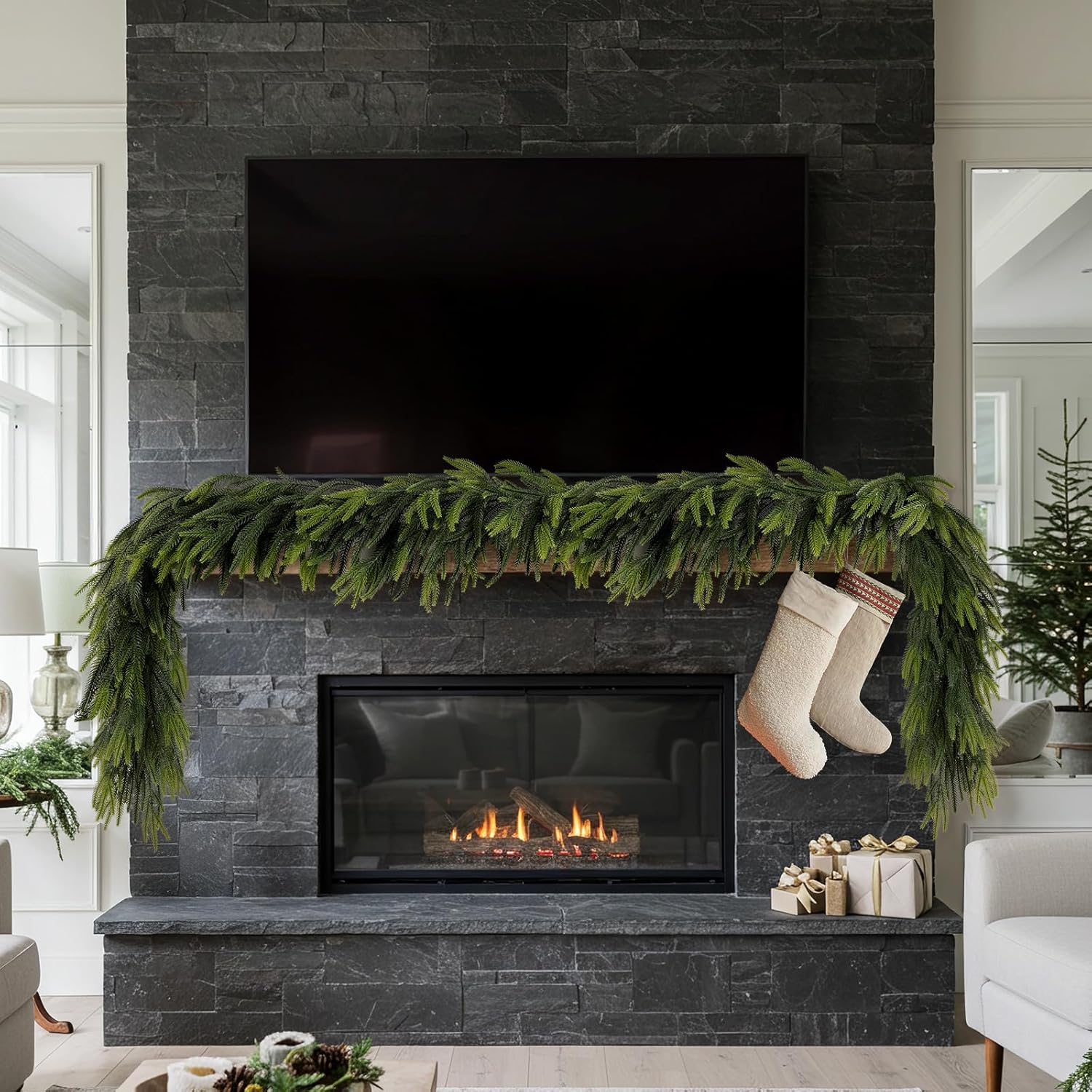 - Real Touch Norfolk Pine Garland: Each pine needle on the artificial pine garland realistic transitions from light green to dark green, mimicking the color of Norfolk pine. No need to spend time on maintenance, xmas garland is always fresh and will not rot
