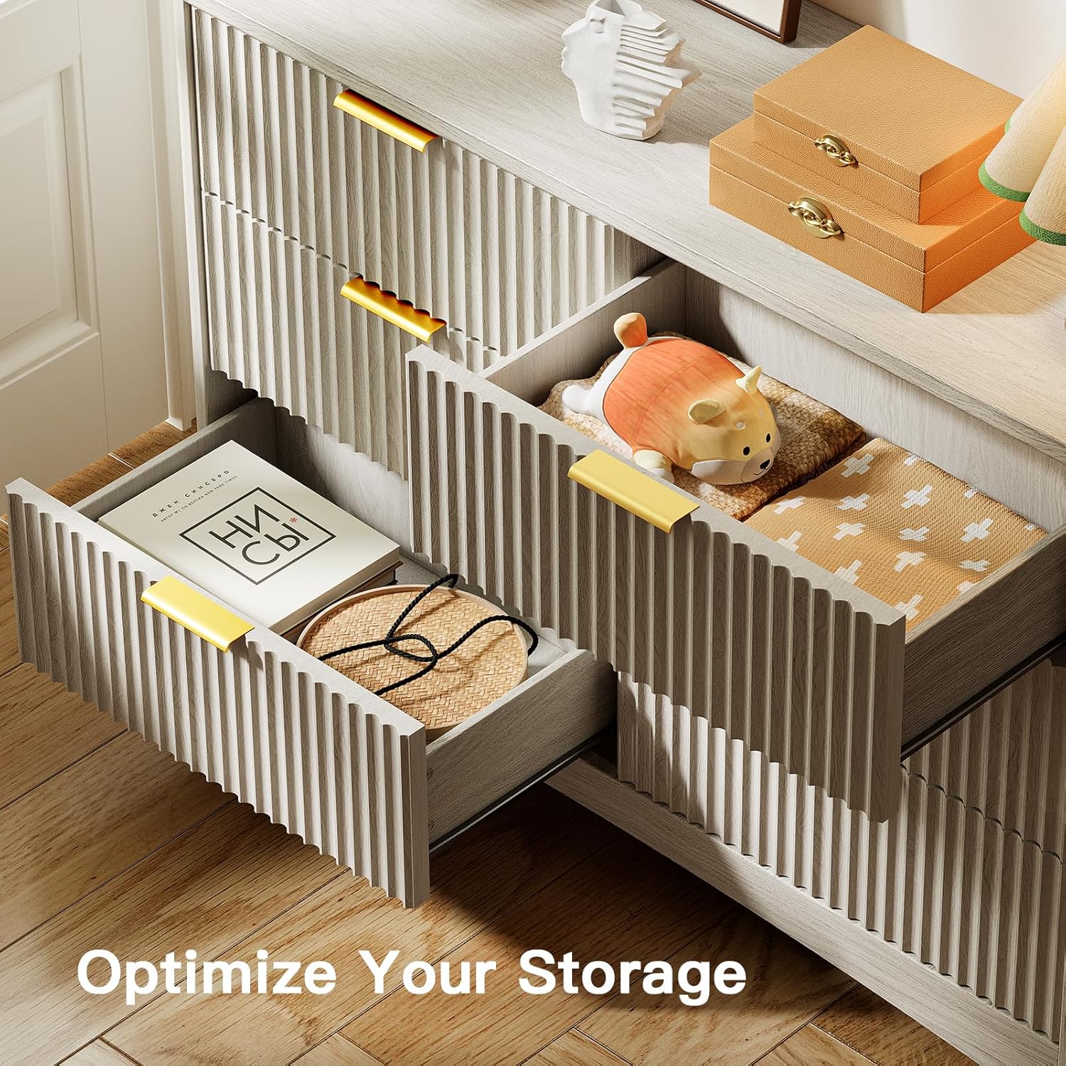 - ăLarge Storage CapacityăThe fluted dresser is equipped with 6 spacious drawers, capable of accommodating over 80 garments, 30 toys, 60 tissues, 80 skirts, 70 hats, and 130 pairs of socks. This generous storage space allows for the organized arrangement of clothing, bedding, cosmetics, or jewelry, thereby assisting you in maintaining a clean and orderly environment.