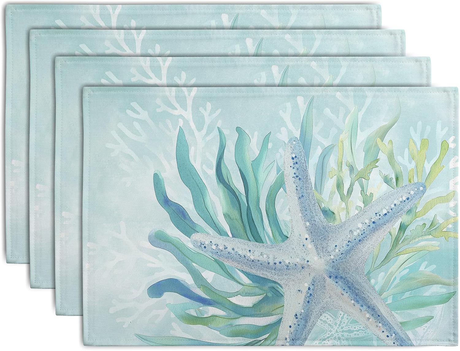 Nautical Coastal Placemats Set of 4 Ocean Coral Starfish Seagrass Beach Theme Table Mat 12x18 Inch Teal Turquoise Blue Summer Linen Fabric Place Mats for Party Kitchen Dining Outdoor Indoor Decor