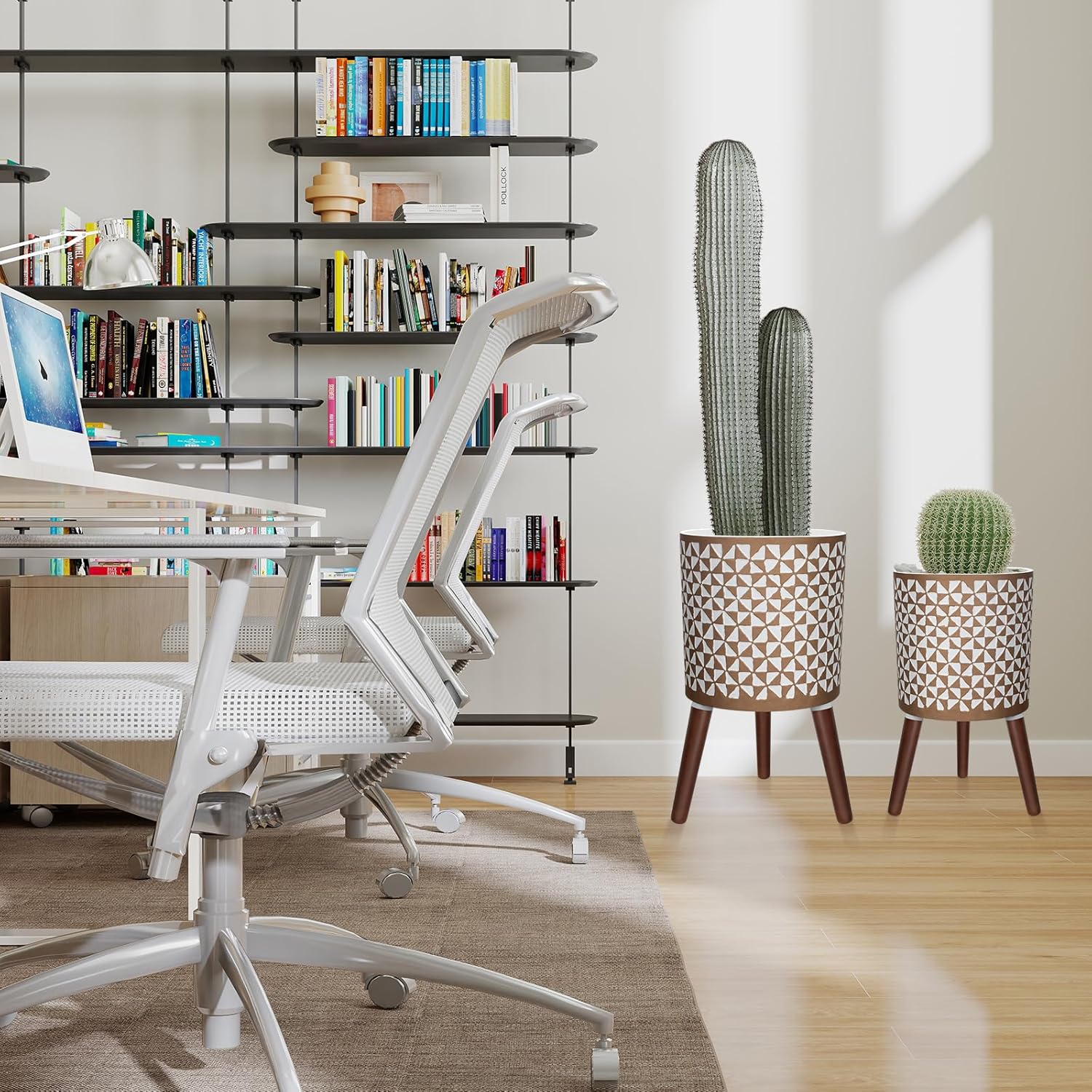 - 【Elegant 3D Pinwheel Design】This planter features a captivating 3D pinwheel pattern in a chic combination of white and gold, perfectly complemented by three sturdy coffee-colored wooden legs. Its unique and eye-catching design adds a modern yet luxurious touch, making it a versatile addition to various decor styles, including contemporary, glam, and mid-century. Ideal for showcasing your favorite plants while elevating the aesthetic of any room.