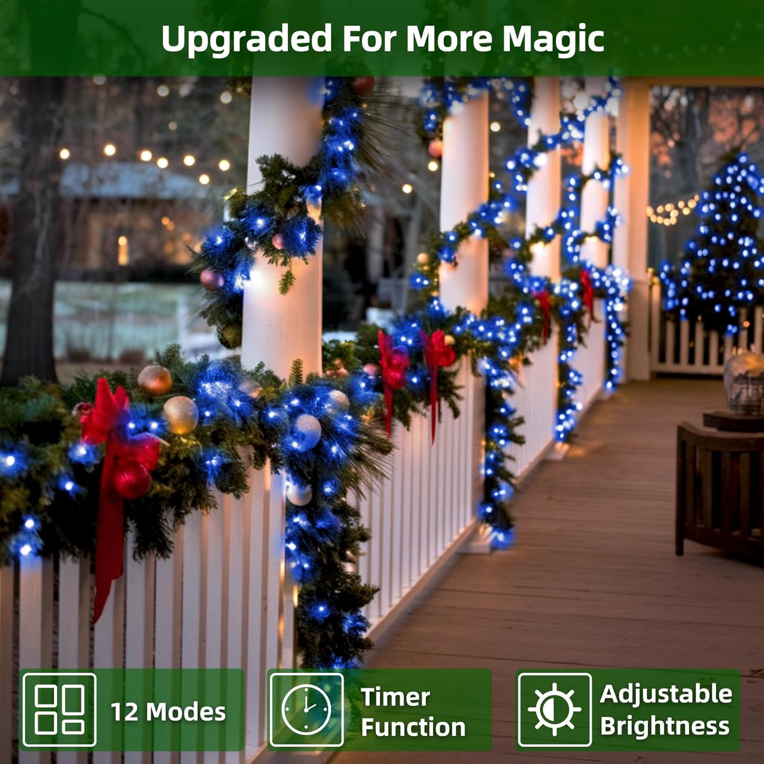 - Perfect Size for Everyday Decorating: At 75ft with 300 LEDs in blue, these Christmas string lights create a calm, dreamy holiday atmosphere. Perfect for balconies, porches, stair railings, mantels, or a 7–9ft Christmas tree. The ideal length for intimate spaces. Connect up to 3 sets (225ft, 900 LEDs total) to transform fences, patios, or your housefront into a serene winter wonderland.