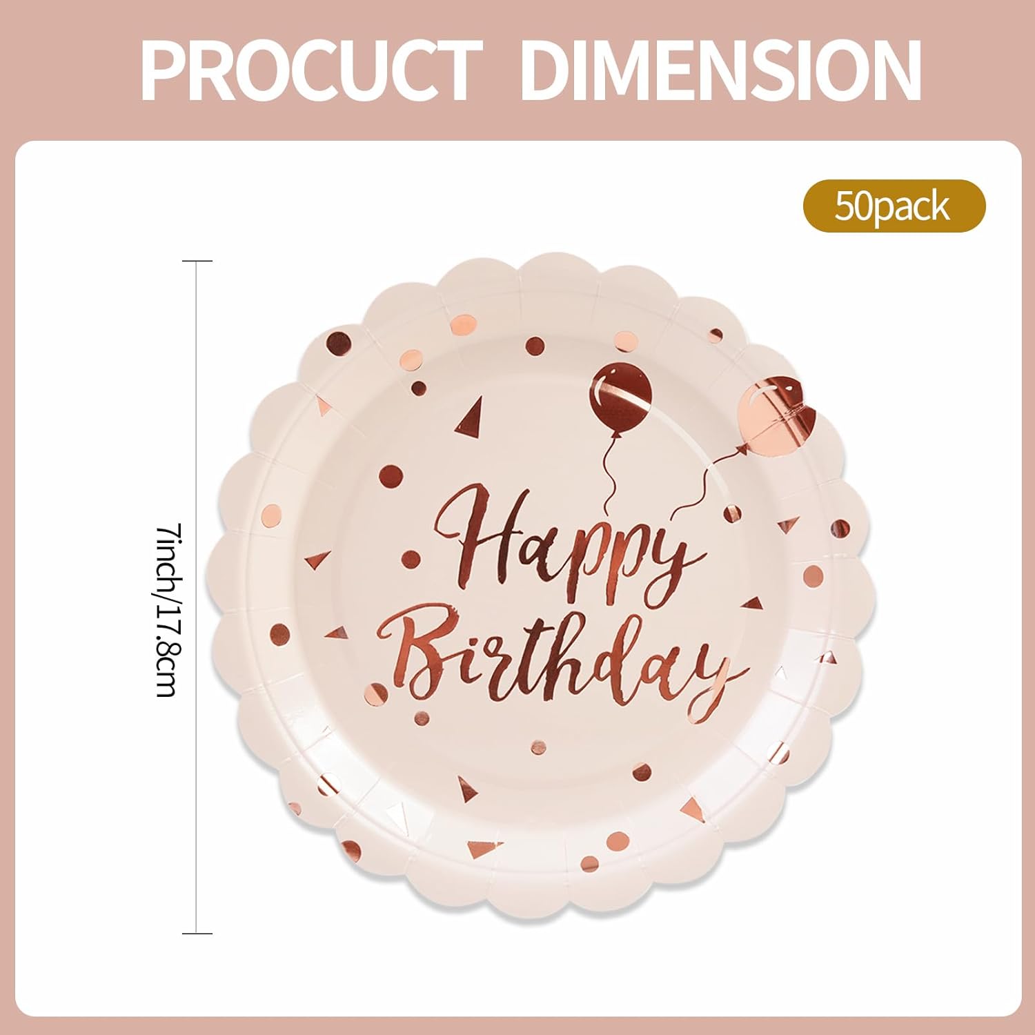 50PCS Pink Rose Birthday Paper Plates - 7 Inch Happy Birthday Cake Plates Scalloped Pink Dessert Plate Disposable Party Tableware Set for Girls Women Birthday's Party Supplies Decorations
