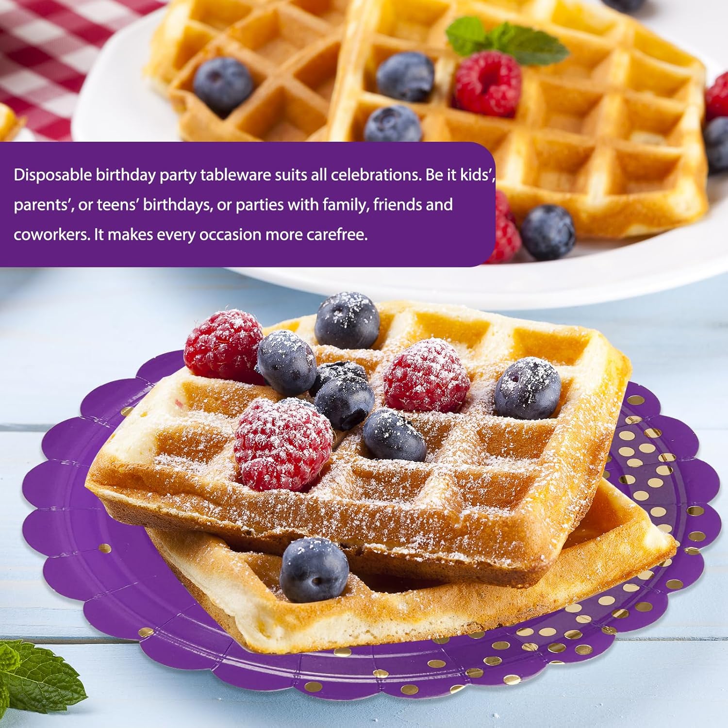 50PCS Purple Paper Plates, 7 Inch Scalloped Purple and Gold Party Plates Disposable Foil Polka Dots Dessert Plate Cake Plate for Wedding Baby Shower Birthday Anniversary Bachelorette Dinner BBQ