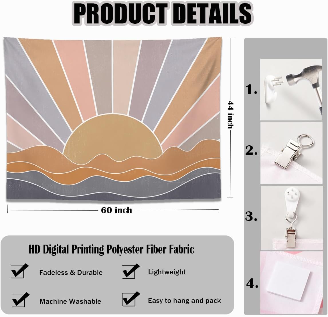 • Boho Sun Tapestry: Brighten your space with this vibrant sun tapestry featuring a retro 70s rainbow design. Perfect for adding boho aesthetic to bedrooms, dorms, or living rooms