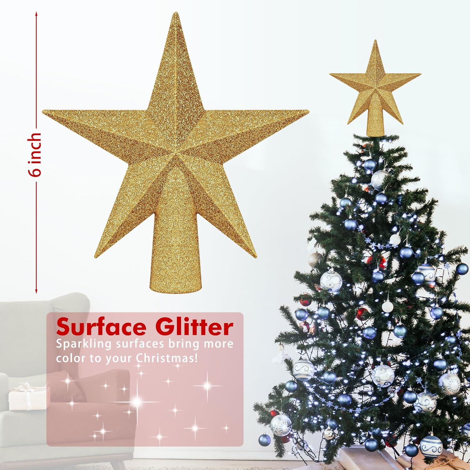 Christmas Tree Topper, 1PCS 6" Gold Glitter Star Tree Topper, 3D Xmas Shatter-Proof Mini Bethlehem Star Tree Topper Decorations, Waterproof Christmas Decor for Holiday Home Outdoor Ornament