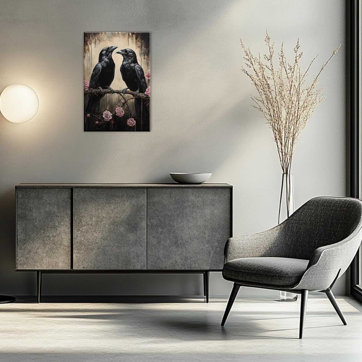 OAAPITI Crow Canvas Wall Art Black Raven Picture Print Pink Rose Poster Vintage Gothic Painting Artwork for Living Room Halloween Decor(Artwork-6,12"x18")