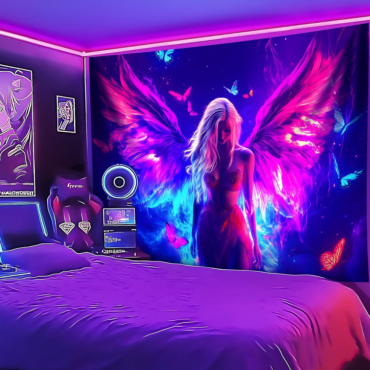 - 【Blacklight/UV Reactive】 Due to the special ink and advanced technology, the blacklight wing tapestry's colors can be changed under Black Light or UV Reactive Light. You can enjoy different effects by kinds of light, the tapestry will be amazing. Under normal light, the colors are also beautiful.
