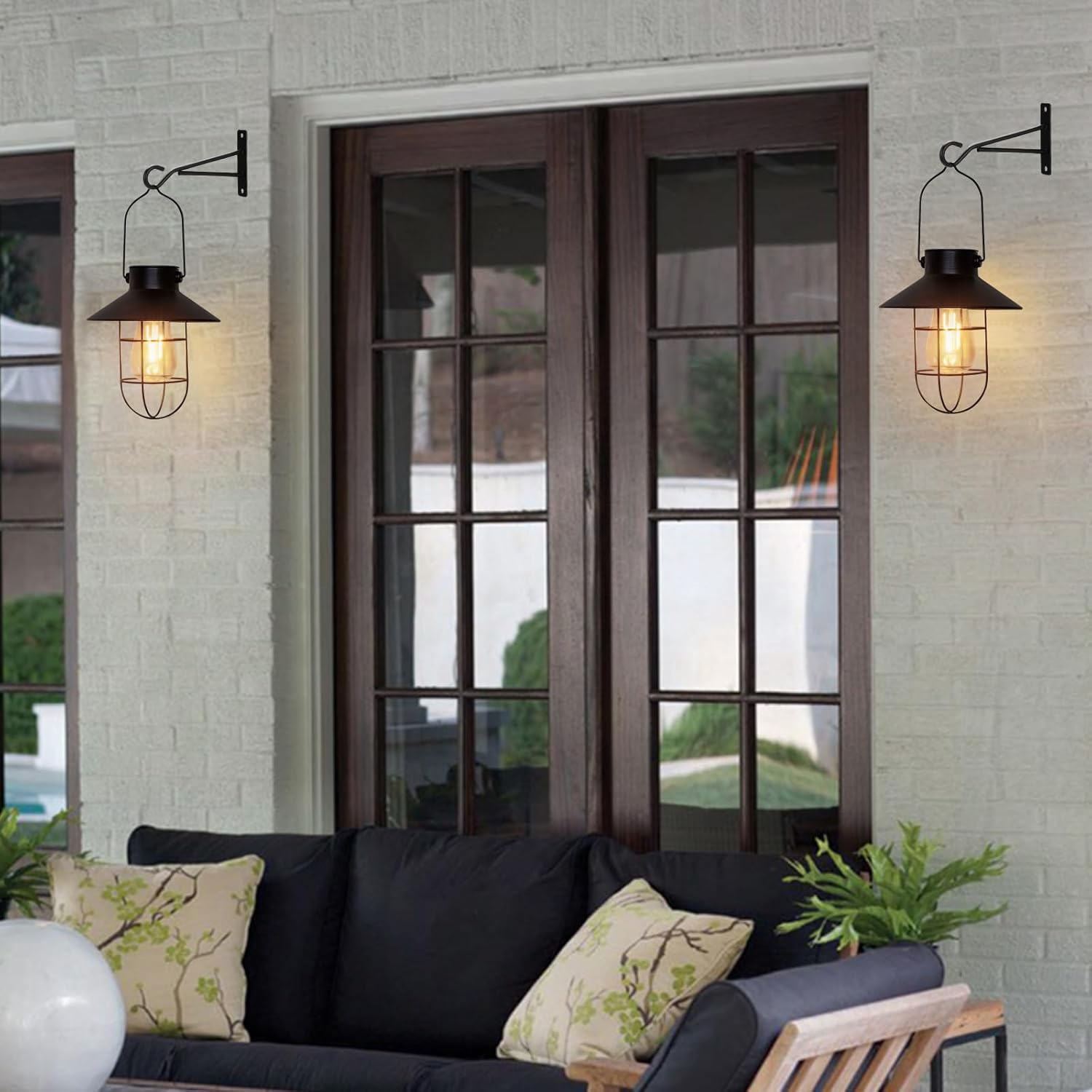 pearlstar Solar Lantern Outdoor 2 Packs Hanging Light Metal Solar Lamp with Warm White Edison Bulb Design for Garden Yard Patio Proch Decor(Black)
