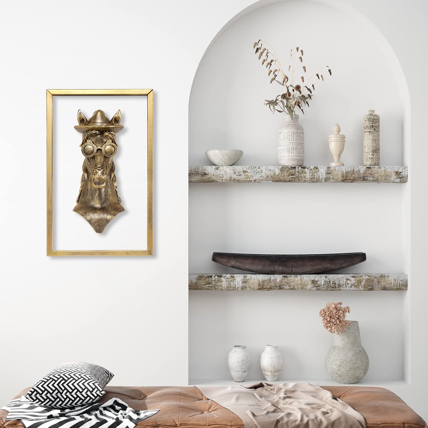 Animal Heads Wall Decor (Includes Metal Frame) Resin Animals Sculptures Head Wall Hanging Decoration Gold vintage Wall Sculpture for Living Room Bedroom Office(Horse)