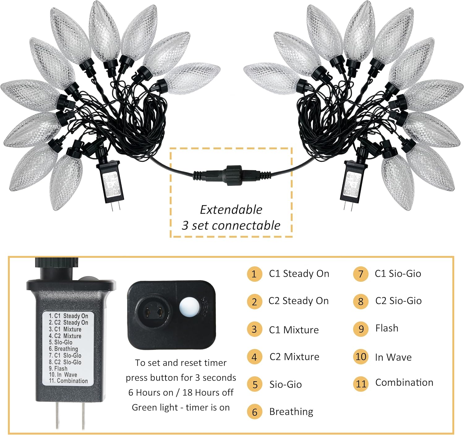 - 【11 Modes Light with Timer & Memory function】 To change the lighting modes, just press the button on the power adapter. There are 11 functions available to suit various occasions. The timer allows the lights to remain illuminated for 6 hours or 18 hours each day. To turn off the timer, simply press the button on the power adapter again or disconnect the lights. The smart memory function retains your selected lighting mode for the next time you turn on the lights.