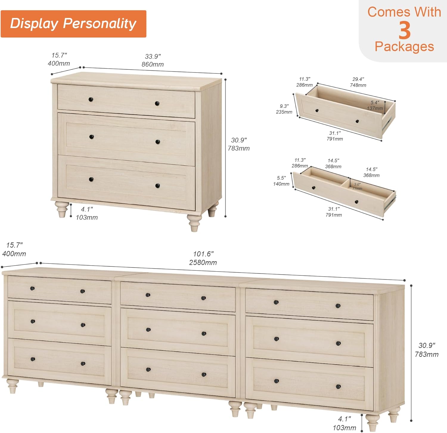 - 【Quick Assembly& 3 Packages】 This wood dresser is sent in 3 packages,so you may receive them at different times.It comes with pre-assembled drawer glides so you can put it together easily.Equipped with smooth metal drawer slides and handles, the drawers of the closet dresser are effortless to open and close.