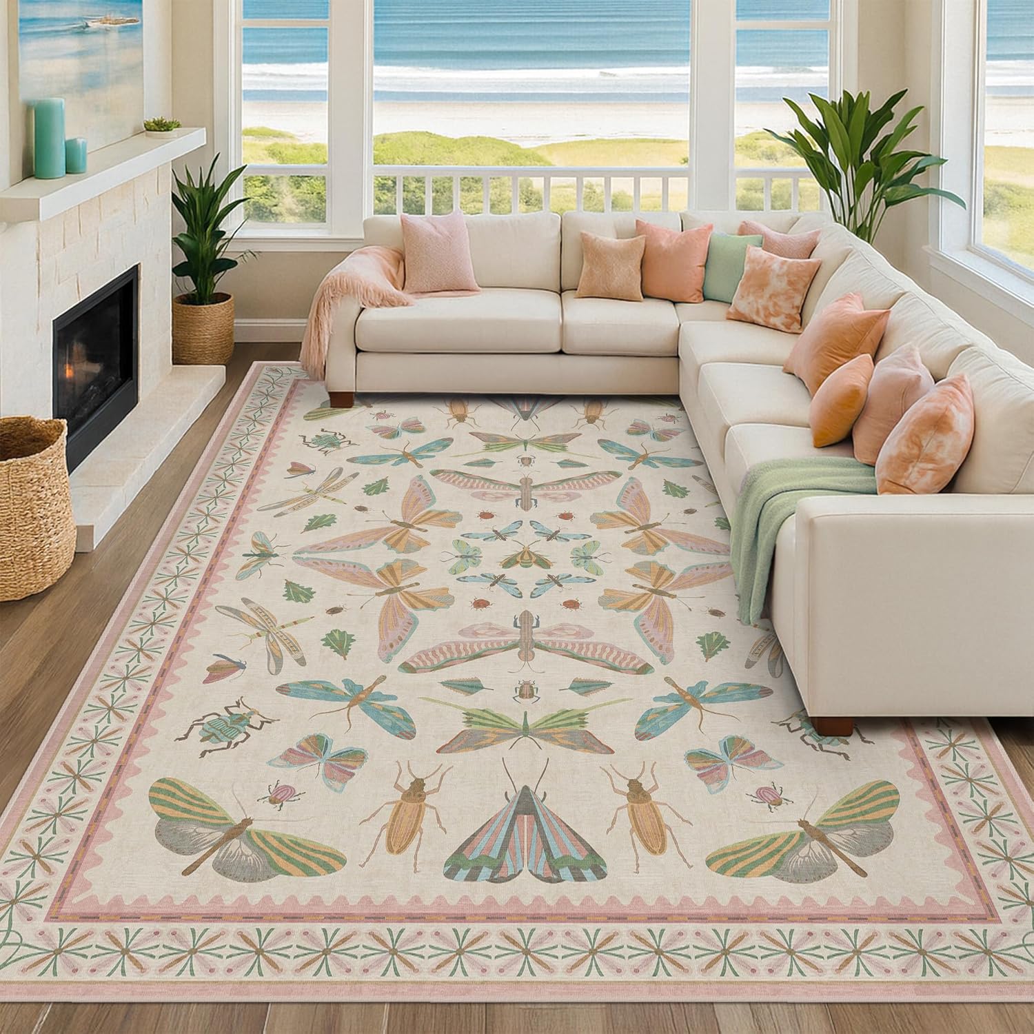 - Whimsical Nature Aesthetic: Brighten your space with this washable rug featuring delicate butterflies, moths, beetles & dragonflies on a soft ivory base. A pastel palette of blush pink, sage green, sky blue, and golden mustard offers cheerful, vintage charm. Its symmetrical layout and scalloped edge echo antique scientific illustrations, blending playful character with timeless design. Framed by a warm pink and green floral border, it's perfect for girls bedroom, nurseries, or boho interiors