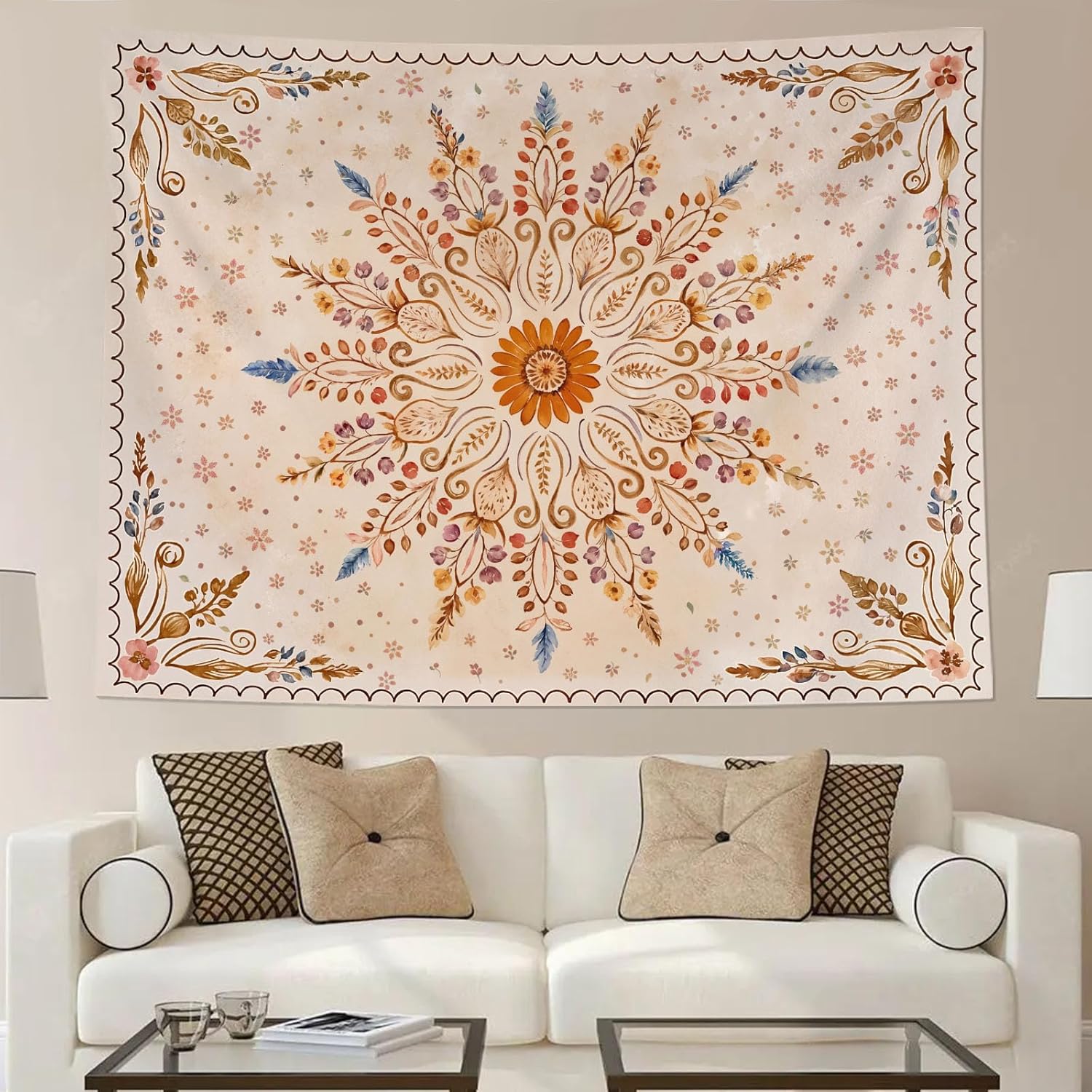 Fowocu Boho Floral Mandala Tapestry for Bedroom Aesthetic Watercolor Bohemian Flower Wall Tapestry Brown Beige Hippie Indian Tapestries Wall Hanging for Living Room Dorm Decor 60 x 44 Inch