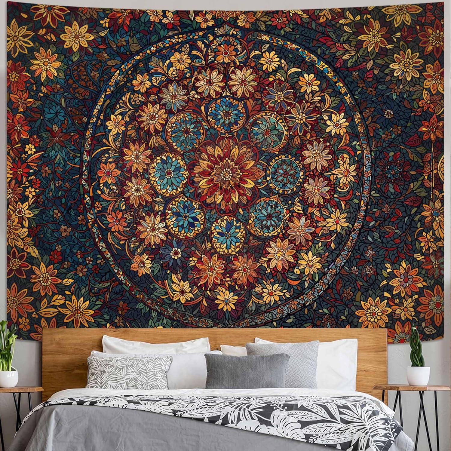 Fowocu Boho Floral Mandala Tapestry Wall Hanging Vintage Bohemian Flower Medallion Tapestry Aesthetic Orange Stained Glass Hippie Extra Large Tapestries for Bedroom Living Room Dorm Decor 90 x 68 Inch