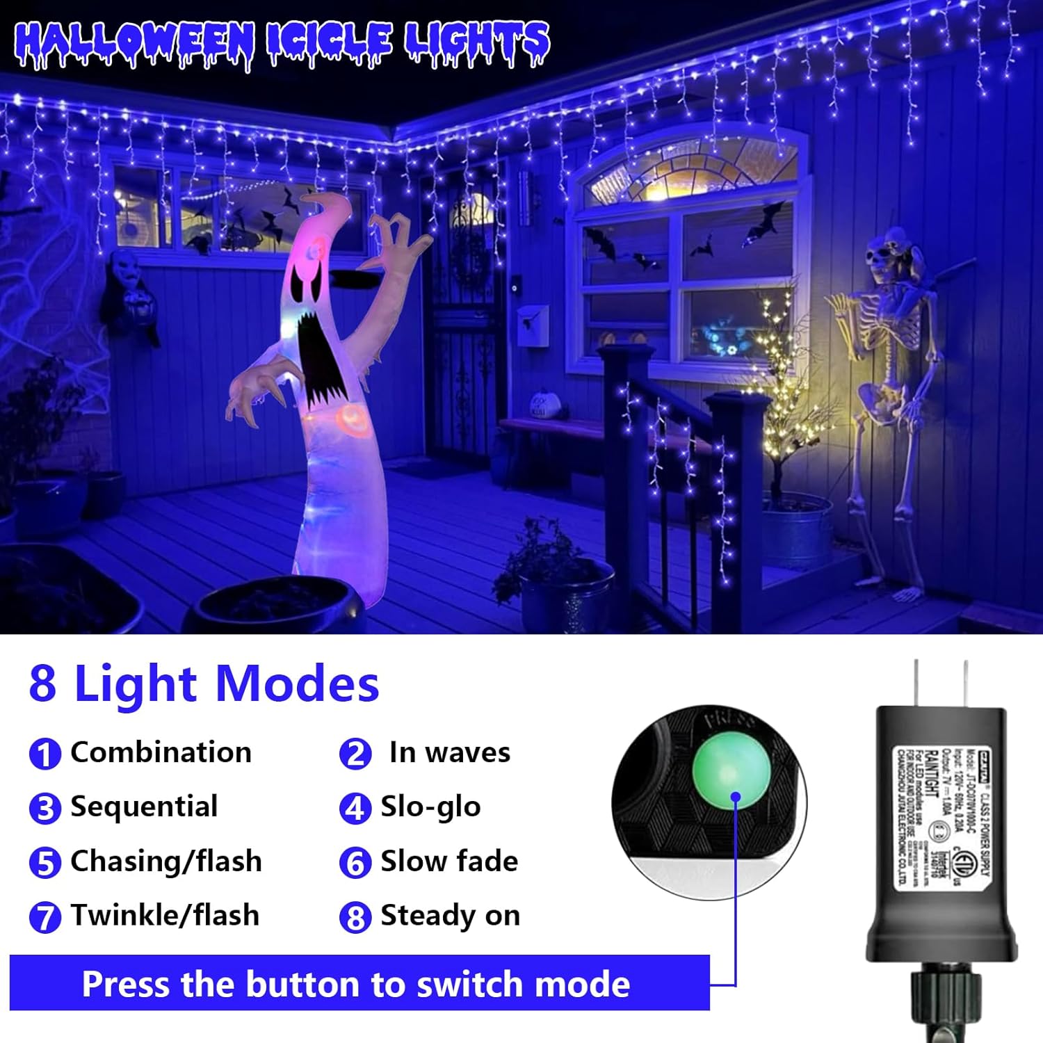 - 8 Impressive Modes Halloween Icicle Lights: There are 8 different settings(① fireflies flashing ② waves fading ③ chasing ④ flashing ⑤ fading slowly ⑥ twinkle ⑦ flashing ⑧ steady on) through the button on the back of the transformer. Different Modes add a playful touch to any occasion, you can decorate Halloween icicle lights with your family and loved ones, enjoy mysterious and horrible ambience and enrich your holiday atmosphere.