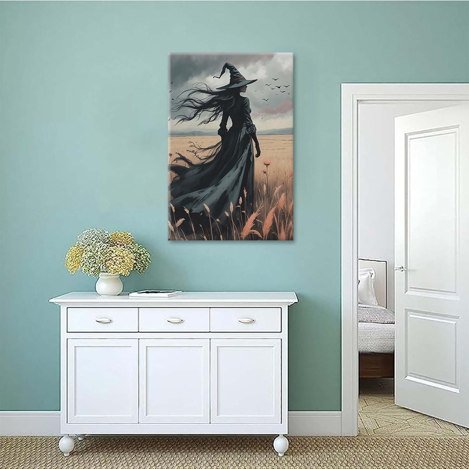 JFHCQJPK Gothic Decor Canvas Wall Art Witch in Rice Field Halloween Art Decor Print Nature Print Victorian Home Bedroom28x40in Frameless