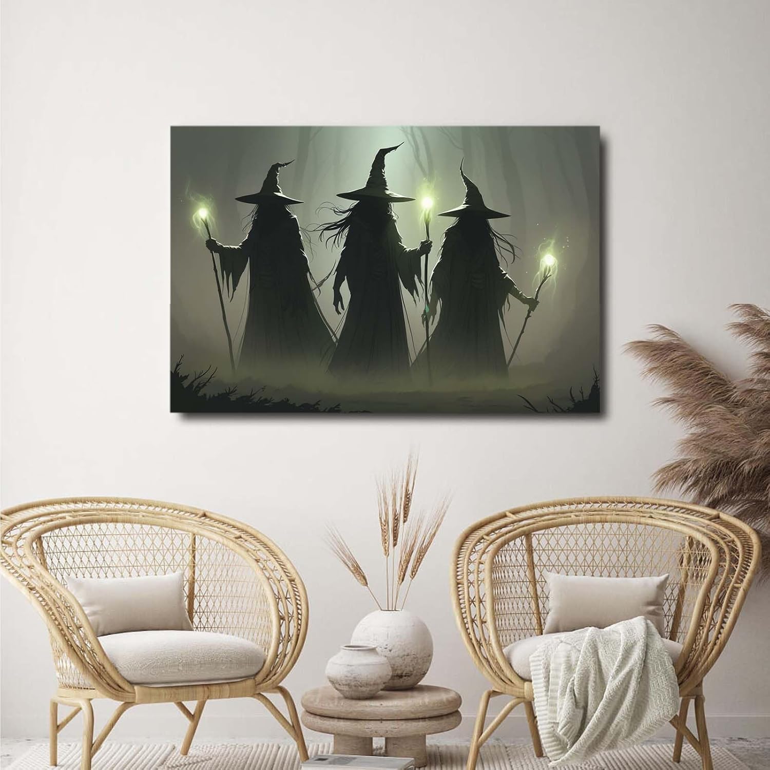 JFHCQJPK Vintage 3 witches canvas wall decor melancholy dark Halloween poster wall decor holding a staff print Gothic horror Halloween painting print for living room bedroom16x24in Frameless