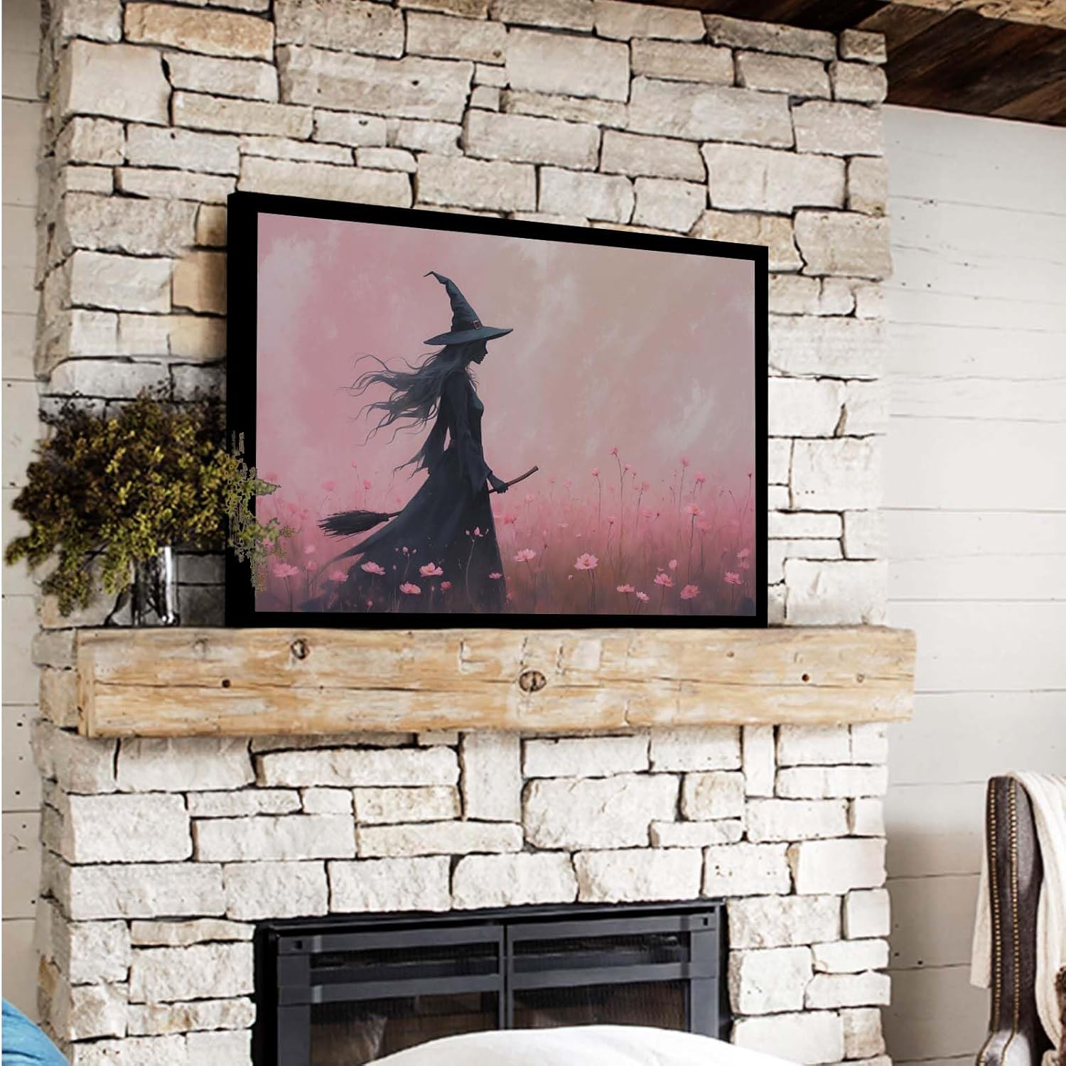 JFHCQJPK Witch in the pink sea of flowers Halloween prints weird flowers wall art silhouette painting fashionable romantic decoration suitable for bedroom16x24in Metal blackFramed