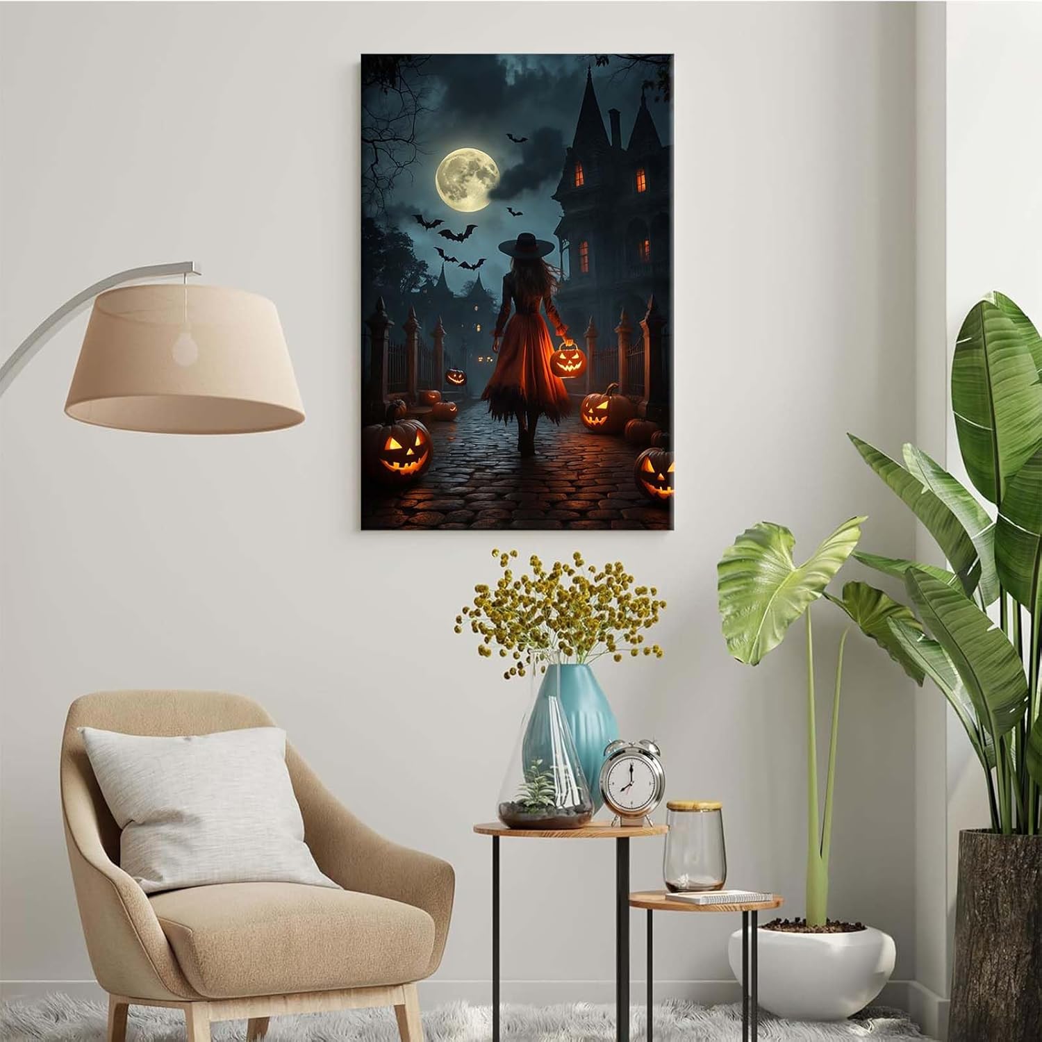 Halloween theme poster moonlit autumn night witch vintage poster art print dark college style gothic painting canvas wall decoration bedroom living room ideal gift8x12in Wood Framed